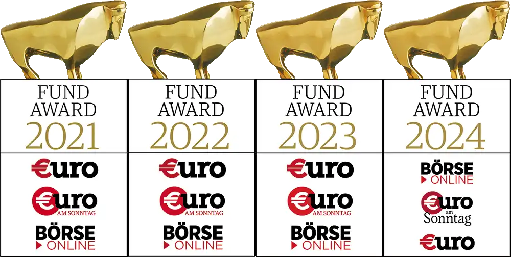 Mit den €uro-FundAwards zeichnet der Finanzen Verlag regelmäßig die besten Fonds der vergangenen ein, drei, fünf, zehn und 20 Jahre aus. Unser Fonds wurde zum vierten Mal in Folge mit dem Fund Award von €uro in folgenden Kategorien ausgezeichnet: